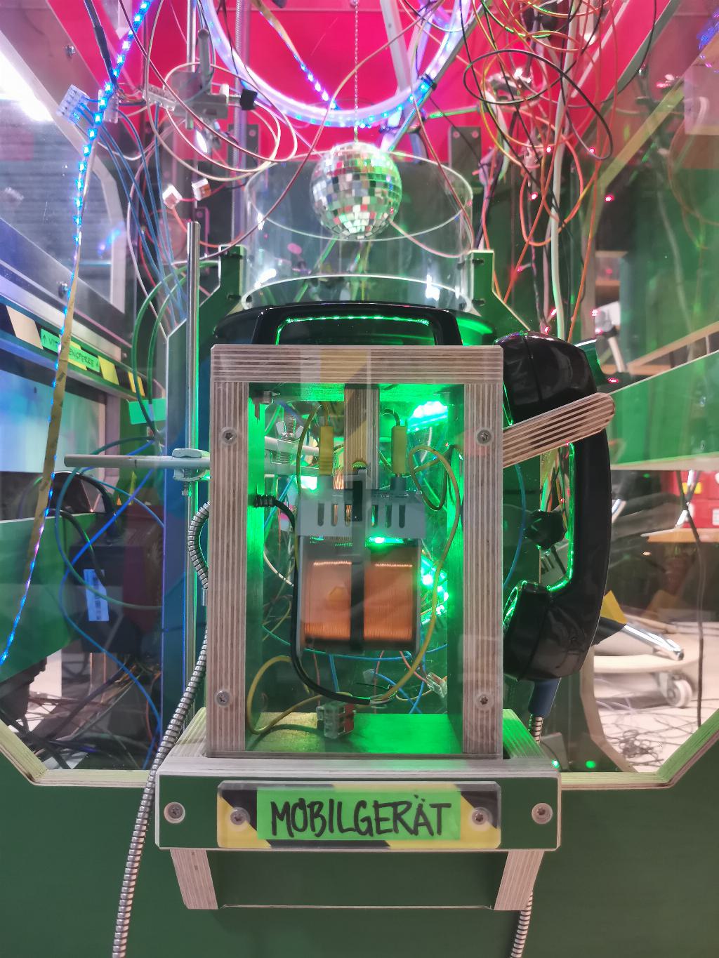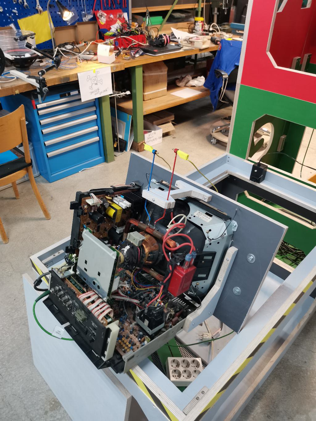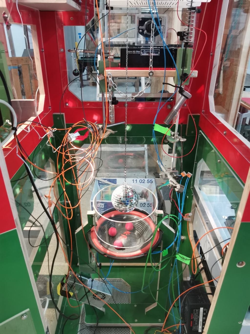 - The abovementioned scooter wheel. It contains a strong BLDC motor which serves as a three phase generator, with each phase producing a different effect. Besides the CRT wobbling, there's also a big bass speaker connected to another phase of the generator. It oscillates heavily and causes ping pong balls placed on it to jump around. Finally, a DC gearmotor connected to the third phase, via a rectifier, spins a disco ball above the speaker, but also the cube shaped info-sign on top of the magnet, which I found, covered in dust, on top of a cupboard in the workshop. A huge analog Voltmeter is connected in parallel to the gearmotor, too, allowing visitors to compare their individual spinning speeds and to participate in a competitive activity.