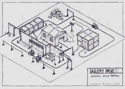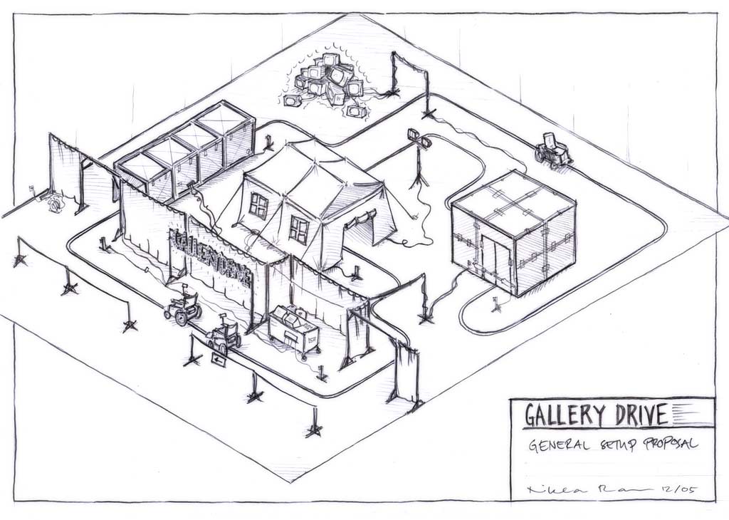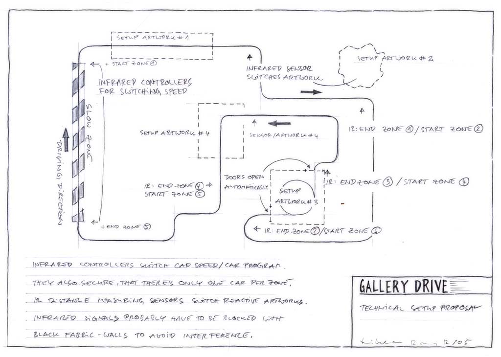 These are very early concept drawings of the Gallerydrive, which I did in december 2005. These images show, how such a setup could look like. However, in the first real exhibition, some things will be different. E.g. I don't want those curtains anymore. I guess, that it will be more interesting for the audience, which doesn't sit inside a vehicle, to see the others, when they are driven through the exhibition. But of course, there can still be some rooms, tents, boxes or tunnels, where the vehicle drives through and the person on the car will be hidden from the audience's views. |