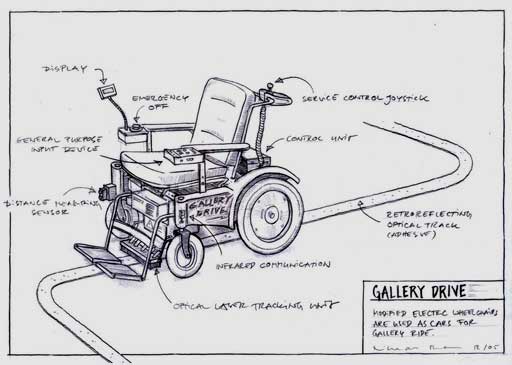 This early drawing shows an idea of how I wanted to solve what we now call Galleryzone system. A lot of infrared devices are involved to control the wheelchairs' functions. In the meantime, I've planned this more precise, as you can read in my wheelchair modifying diary entries from 25.8.06 and 27.8.06. |