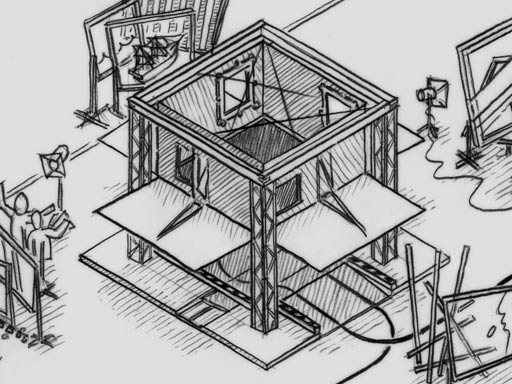 | Back to the diary | During the last weeks, I thought about what could be shown inside the white cube. To explain the possible content, I've made this drawing below. You can click here for a hires version of the sketch. |