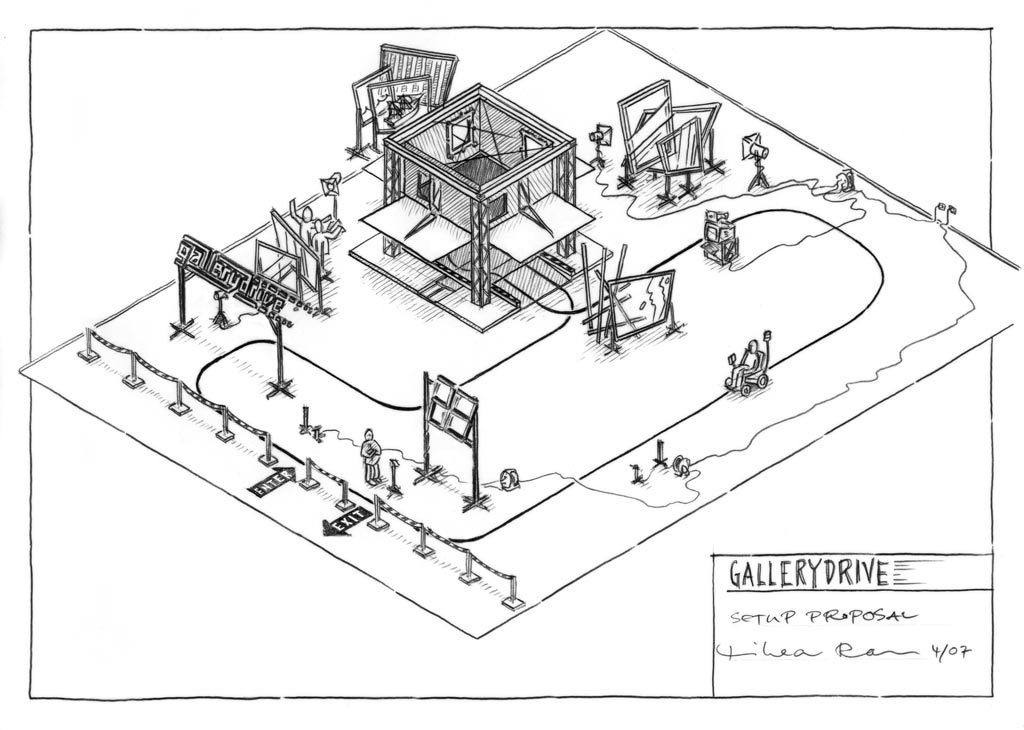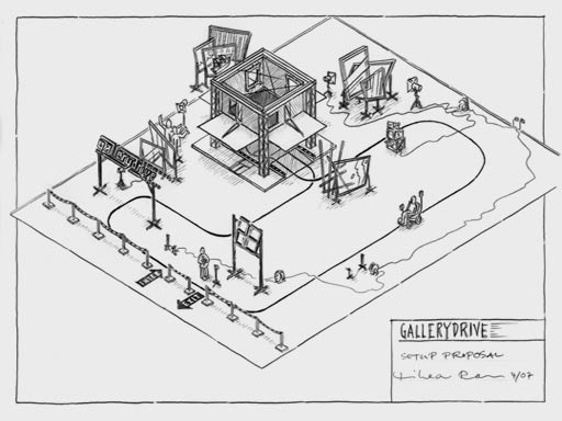 Let's have a closer look to the white cube in this drawing. As you can see, there are frames on the wall and the wall inside those frames is cut out. So, once the viewer is inside the room at one of the defined positions for watching each image, he has a determined perspective through the frames and he will look at one of the four installations outside. I would be happy, if those four installations would look very abstract from outside, but once you see them through the "windows", they disclose their content. A possible way to reach this, might be also to change the lighting situation on the installations, when the visitor watches each "picture". It could be also interesting, not just to have installations but maybe also a performance group, who plays a 15 seconds theatre play for each visitor - somehow, like a tableau vivant. Or it is possible not only to set up static installations, but kinetic ones, which show a picture in motion, as soon as the Gallerydrive car is in the correct position for watching it. There would be many different ways to create those images, and I think it offers a good basis to let other artists participate in a Gallerydrive show. |