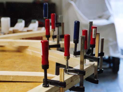 On the left, you can see some c-clamps. With them, I have glued sheets of HDF on some wood beams. This construction will not only provide the stability for the top frame but also support the hanging ceiling at the end. |