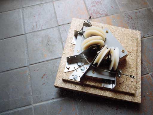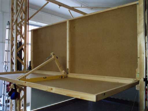 On this picture, you can see that I've attached one of the triangles to a wall. A wire rope is attached to that triangle. When the motor pulls this rope, it first turns the lower side of the wall into a 90° position - then it will be stopped by another triangle which is mounted on the top part of the wall - and the whole room will be lifted when the rope is pulled further. |