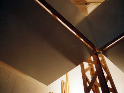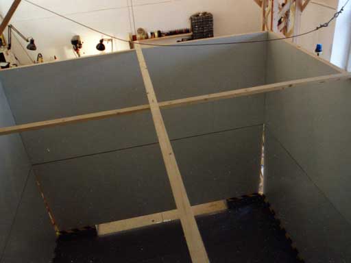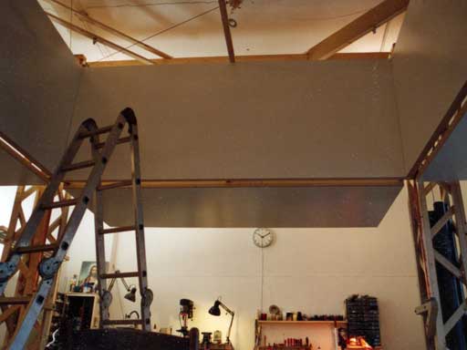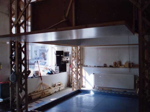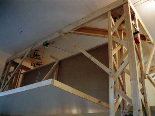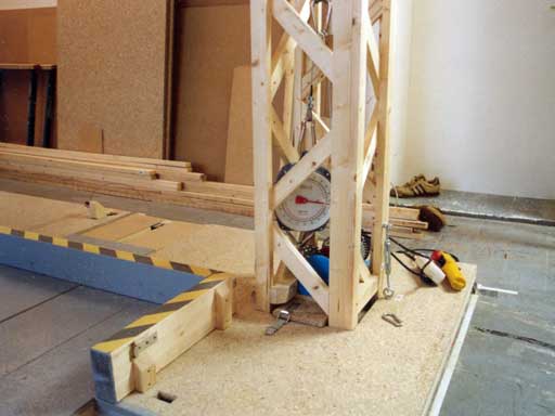 For the first lifting tests, I had to attach this cross of wooden slats to the top of the room, due to reasons of static stability. Later, I want to replace them by some small ceiling parts. |