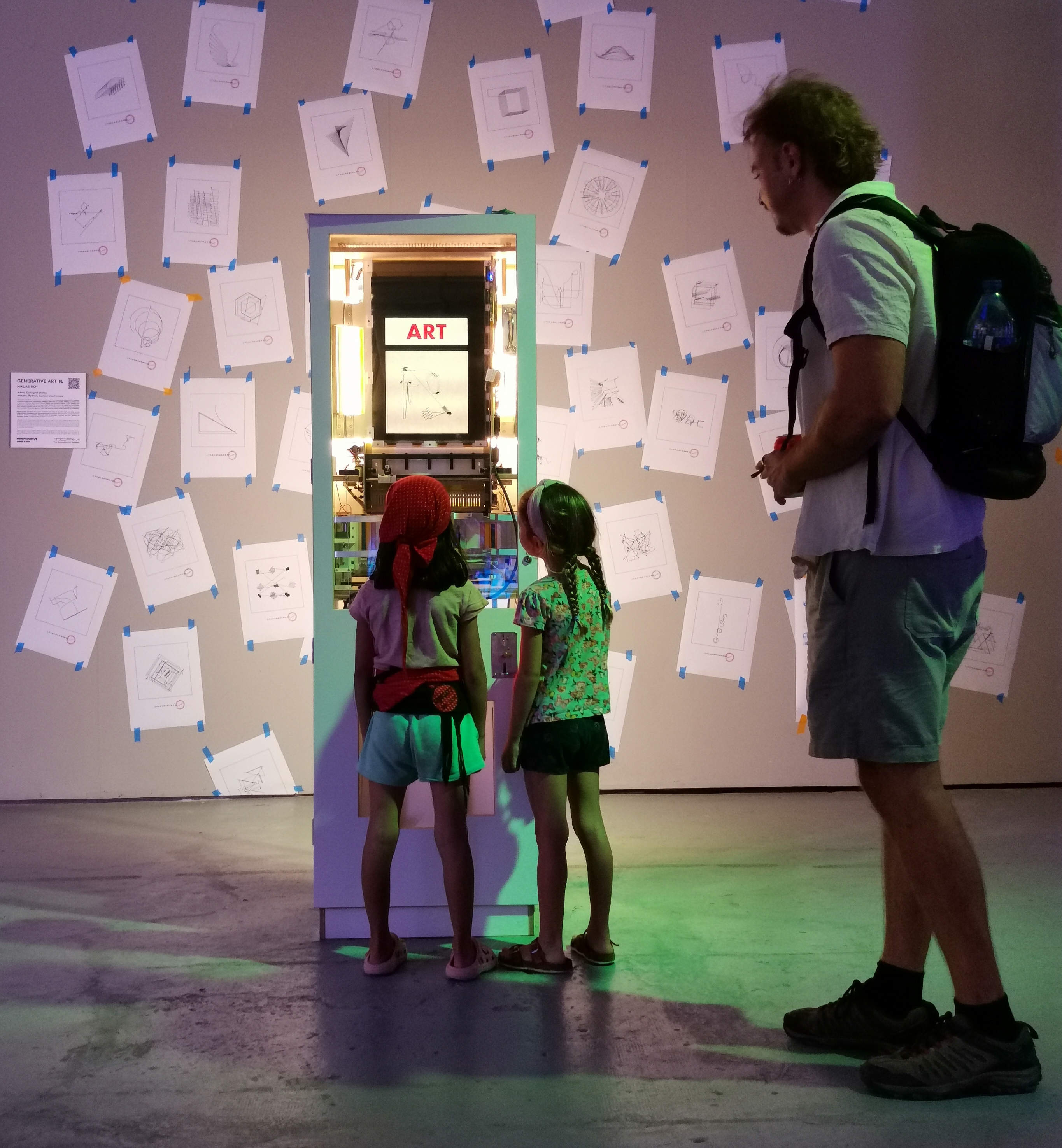 Shifting from passive observer to active participant, the audience plays a crucial role in the process. They make the curatorial decision to give the ephemeral digital drawing value and to turn it into a physical work. Inserting a coin triggers a pen plotter to precisely transfer the digital lines from the screen to paper. Once completed, the drawing is labeled with the seed value, then stamped for authenticity, emphasizing its status as an original work. The participant just became a collector of fine art and can take the art piece home.
